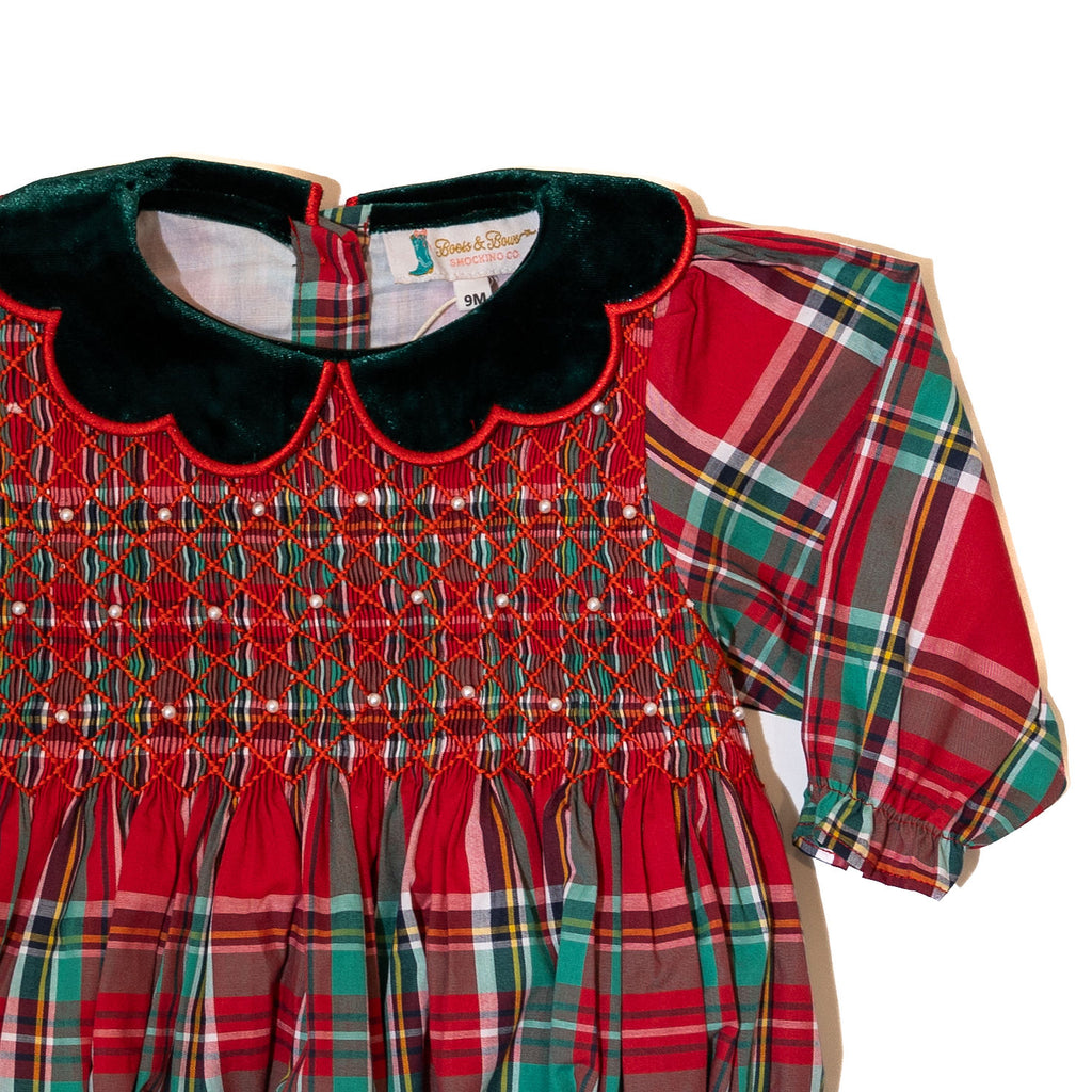 This beautiful long-sleeved bubble is made out of our classic Christmas Plaid woven fabric with a beautiful smock design adorned with pearls. The scalloped collar is made out of a delicately soft green velvet fabric. We hope this compliments your family's Christmas traditions!